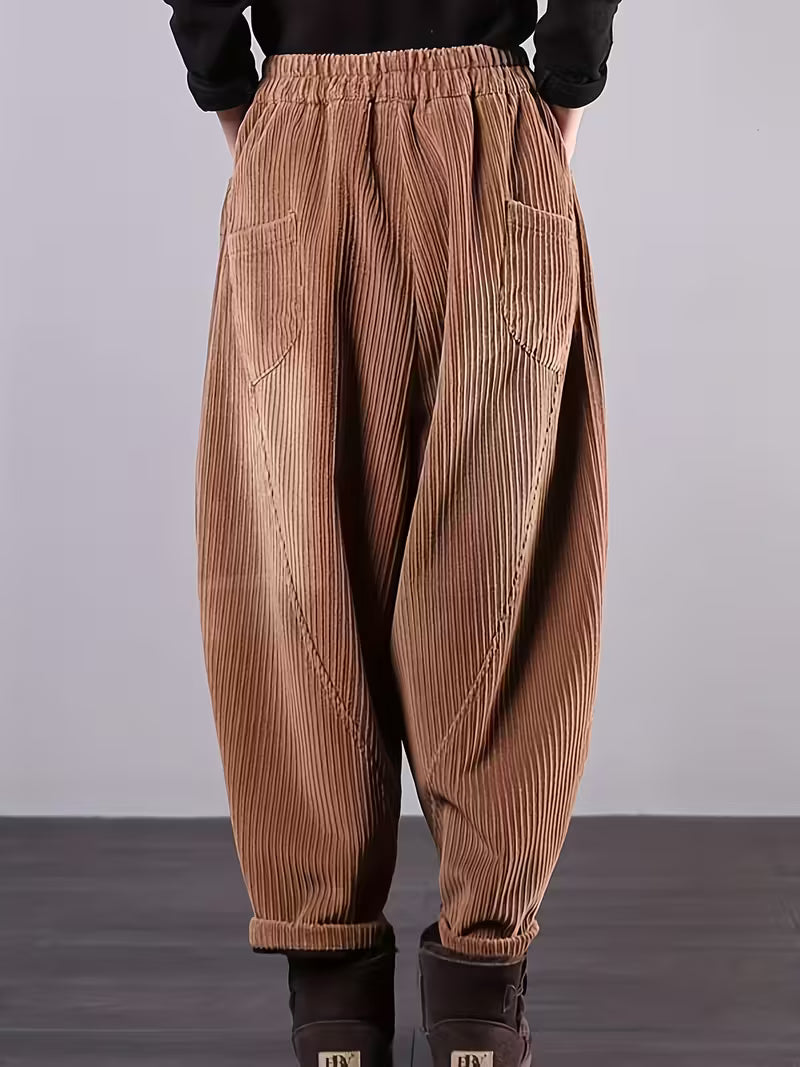 Spodnie damskie prążkowane z szeroką formą elastyczną talią i kieszeniami