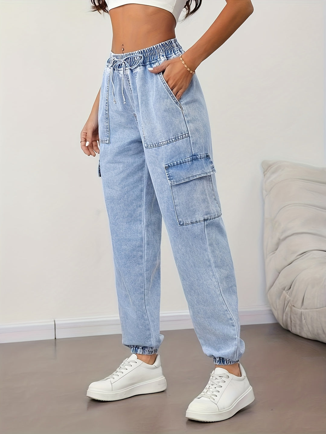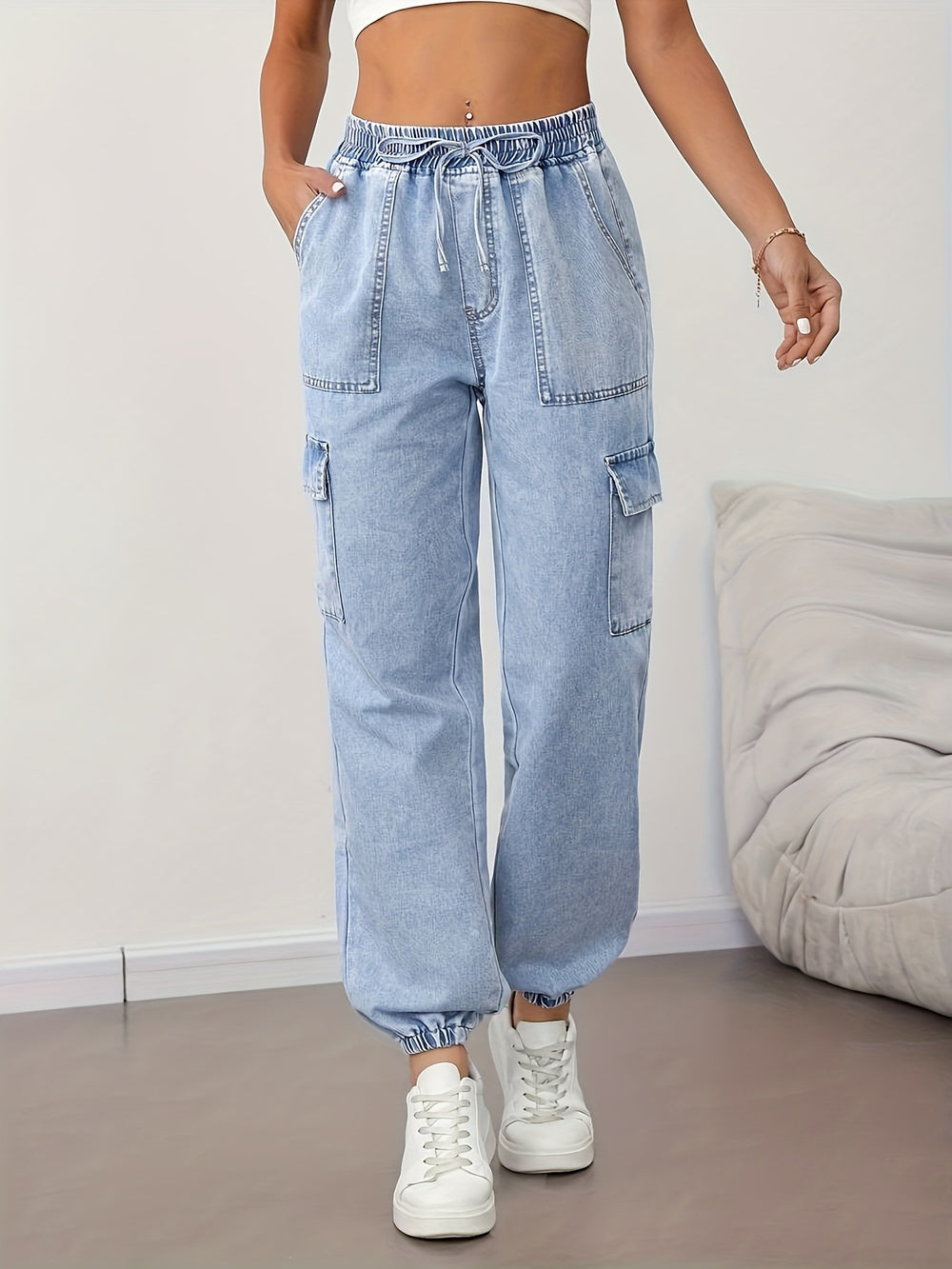 Spodnie damskie denimowe z elastyczną talią kieszeniami naszywanymi i ściągaczami na dole