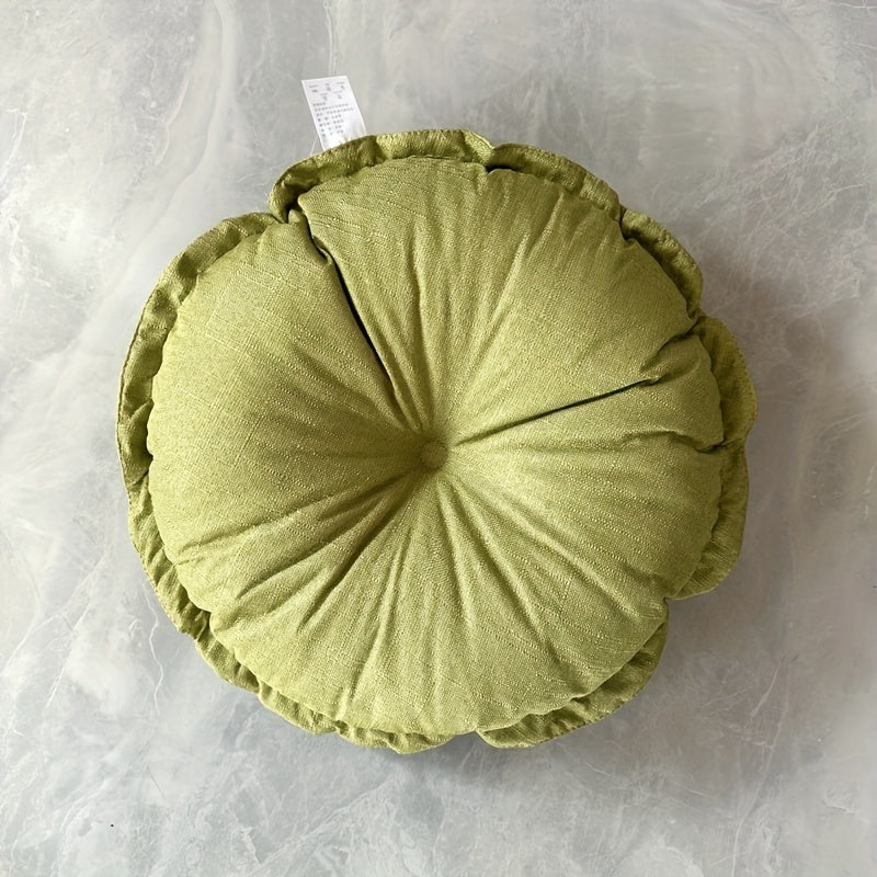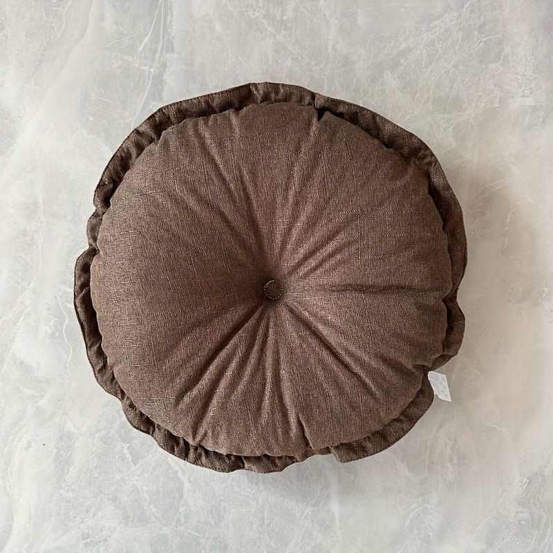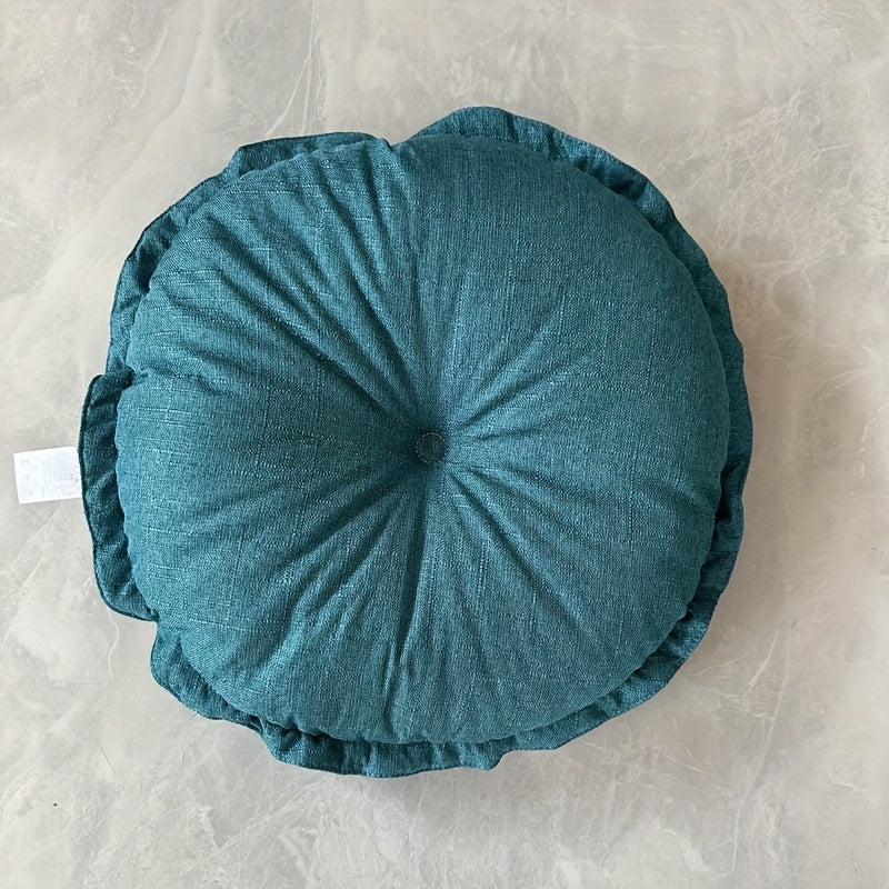 Okrągły puf z marszczeniem i centralnym guzikiem. Ma wyrazisty, nieznacznie wypukły kształt, który nadaje mu dekoracyjny charakter i pozwala korzystać z niego jako niskiego siedziska lub podparcia. Stanowi praktyczny element wyposażenia do codziennego użytku.