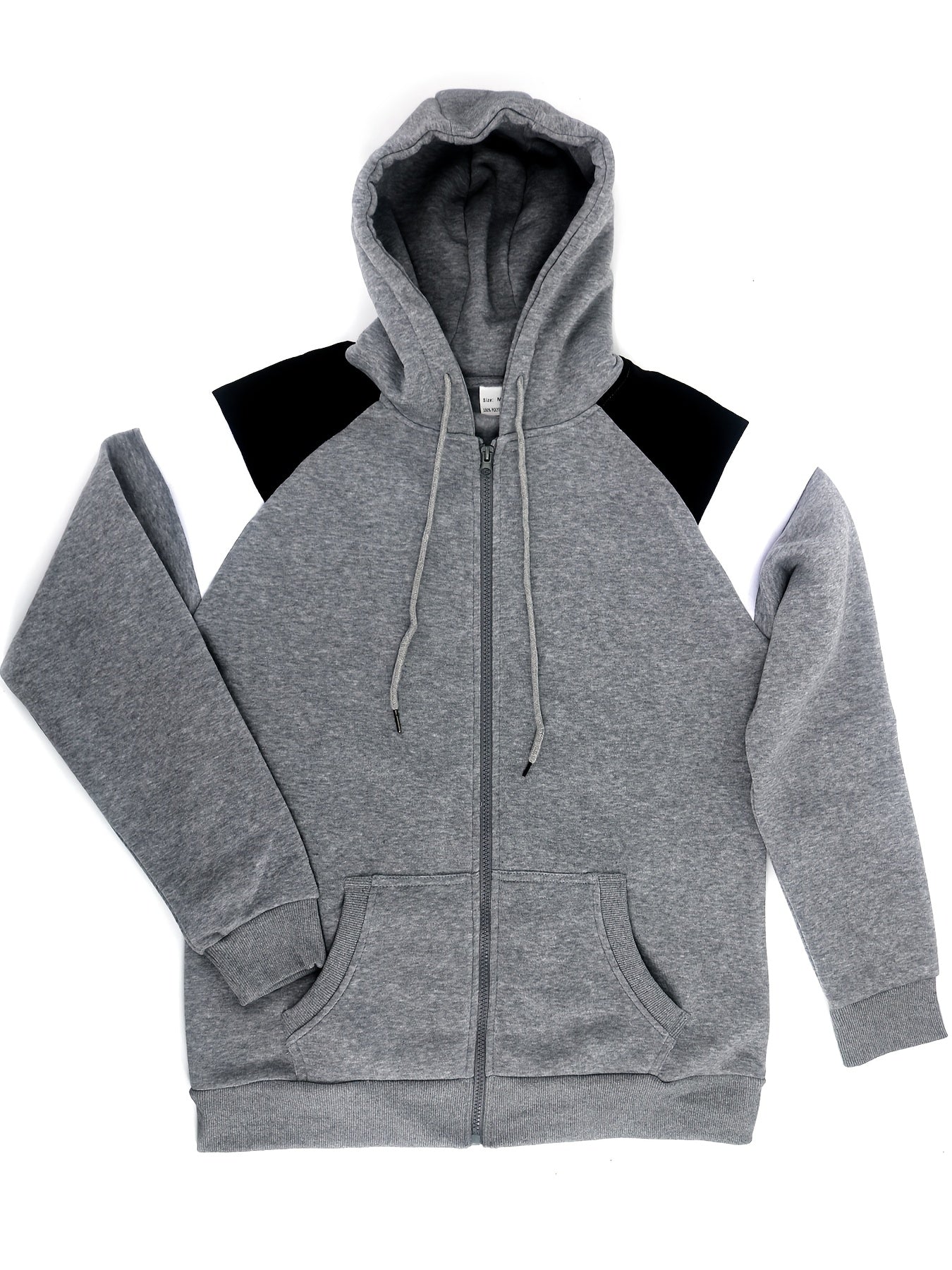 Bluza o klasycznej długości z panelem frontowym o jednolitej powierzchni oraz szerokim kapturem z troczkami. Przód ma zamek na całej długości a po bokach znajdują się kieszenie typu kangurka natomiast na ramionach umieszczone są kontrastowe wstawki o prostych krawędziach.