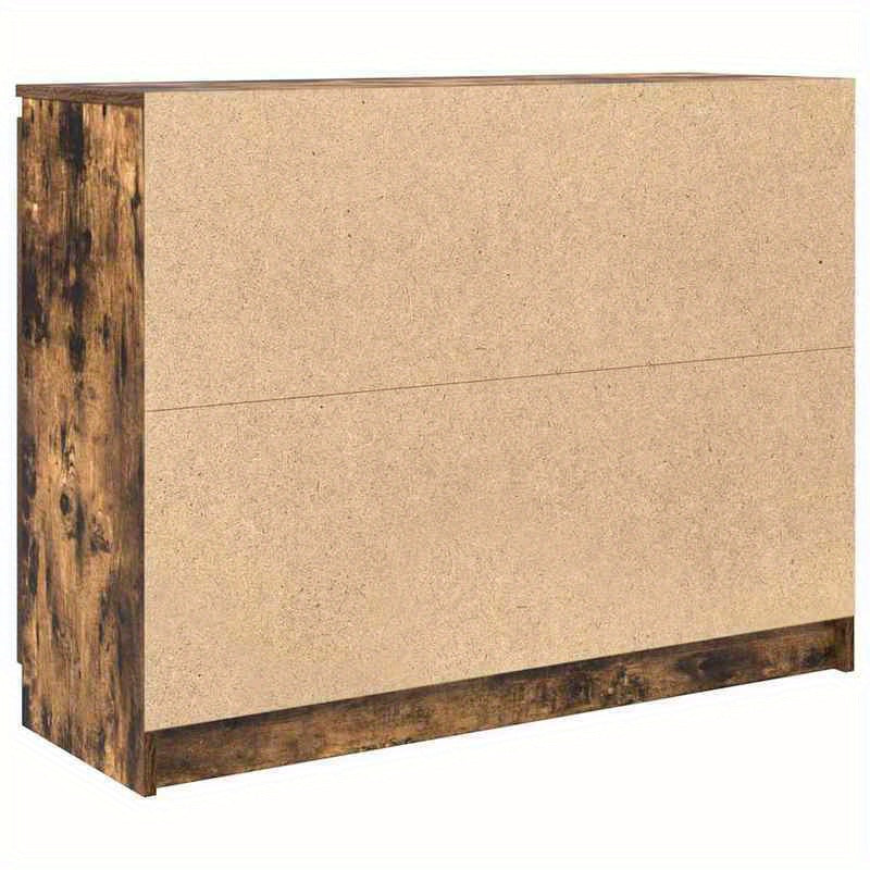 Komoda z czterema szufladami i dwiema bocznymi szafkami z półkami. Korpus wykonany z płyty wiórowej w odcieniu ciemnego dębu. Centralny układ szuflad i zamykane boki pozwalają przechowywać przedmioty różnej wielkości. Mebel sprawdzi się w salonie, jadalni lub przedpokoju.