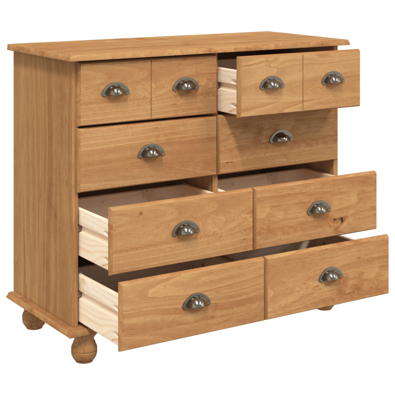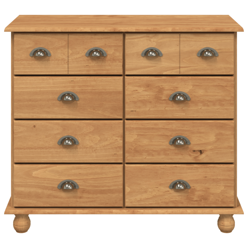 Komoda z ośmioma szufladami rozmieszczonymi w dwóch kolumnach. Dwie górne szuflady są mniejsze i przeznaczone na drobiazgi, a sześć dolnych ma większą pojemność. Korpus mebla opiera się na drewnianych nogach, a metalowe uchwyty typu muszla podkreślają klasyczny układ frontów. Komoda sprawdzi się w sypialni, salonie lub przedpokoju jako praktyczne miejsce do przechowywania odzieży i dodatków.