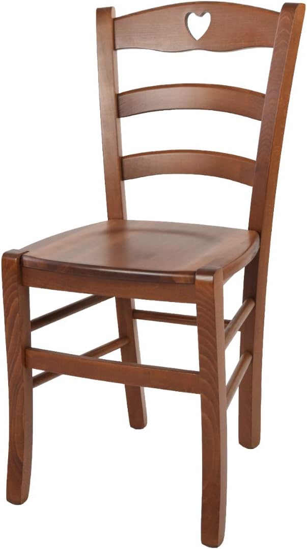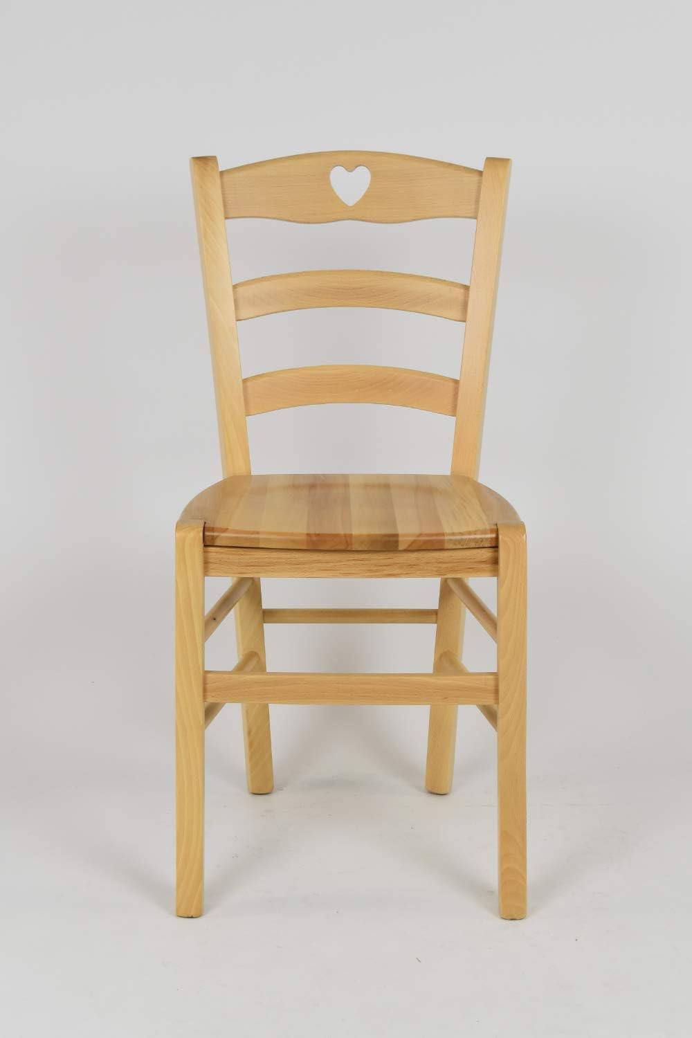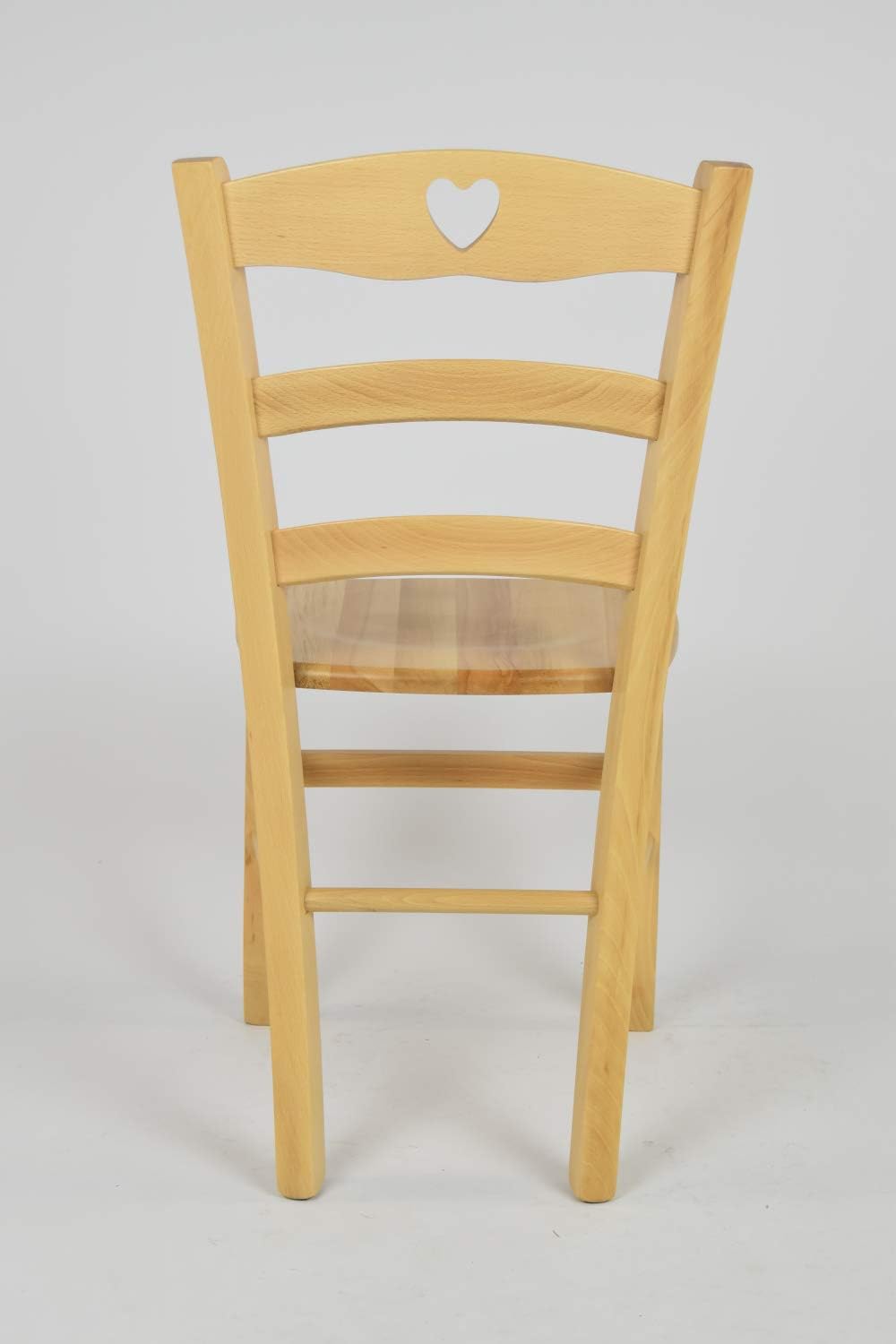 Krzesło o klasycznej, domowej formie z zaokrąglonym oparciem i trzema poziomymi listwami, z których górna ma wycięty motyw w kształcie serca. Siedzisko ma subtelne wyprofilowanie, a pełna drewniana rama nawiązuje do tradycyjnego wyposażenia kuchni i jadalni. Może służyć jako codzienne miejsce do siedzenia lub jako element uzupełniający w domowej przestrzeni.