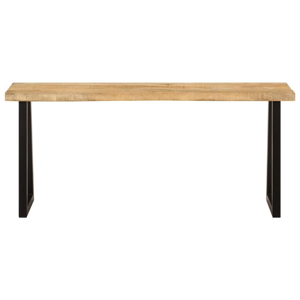 Ławka z prostokątnym siedziskiem o wyraźnie zaznaczonych krawędziach i delikatnie nieregularnej powierzchni. Podstawę tworzą dwie metalowe nogi w formie otwartych trapezów ustawionych pod skosem, co daje stabilne podparcie na całej szerokości. Taki układ sprawdza się przy stołach lub jako samodzielne miejsce do siedzenia w domowej przestrzeni.