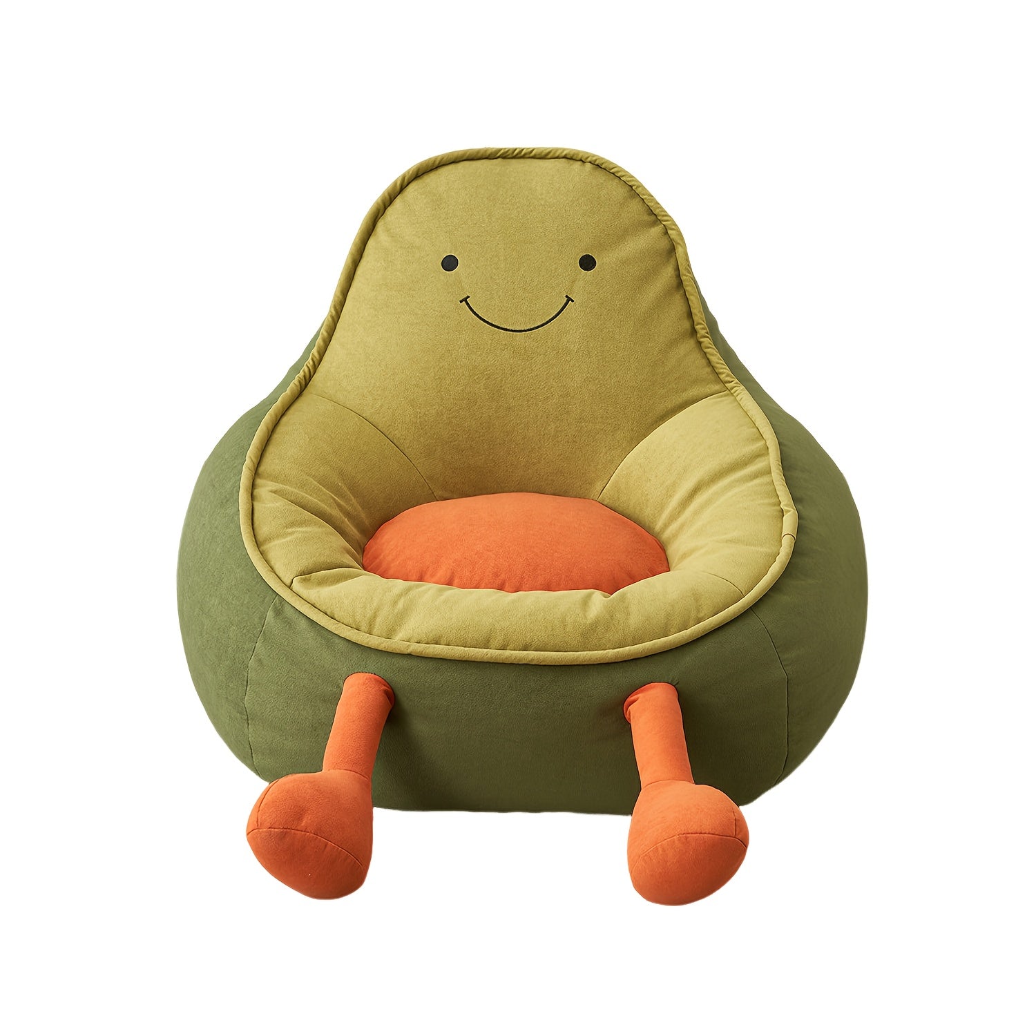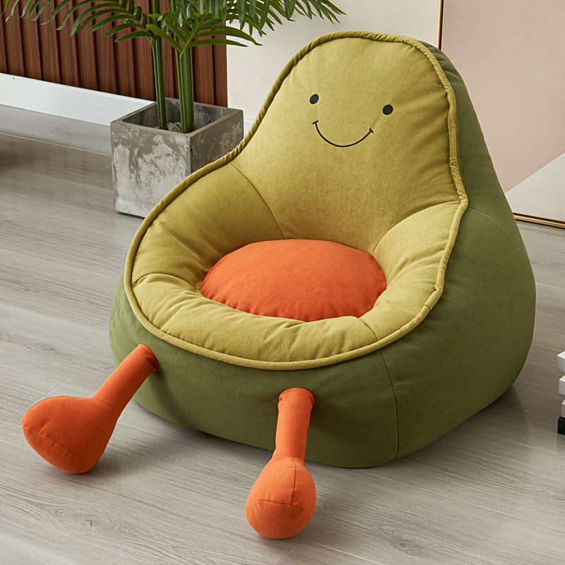 Puf dziecięcy w stylistyce inspirowanej motywem awokado, z oparciem i doszytymi elementami przypominającymi nogi. Na froncie znajduje się haftowany uśmiech, który podkreśla jego przyjazny charakter. Model stanowi praktyczne i dekoracyjne siedzisko do pokoju dziecięcego lub strefy zabawy.