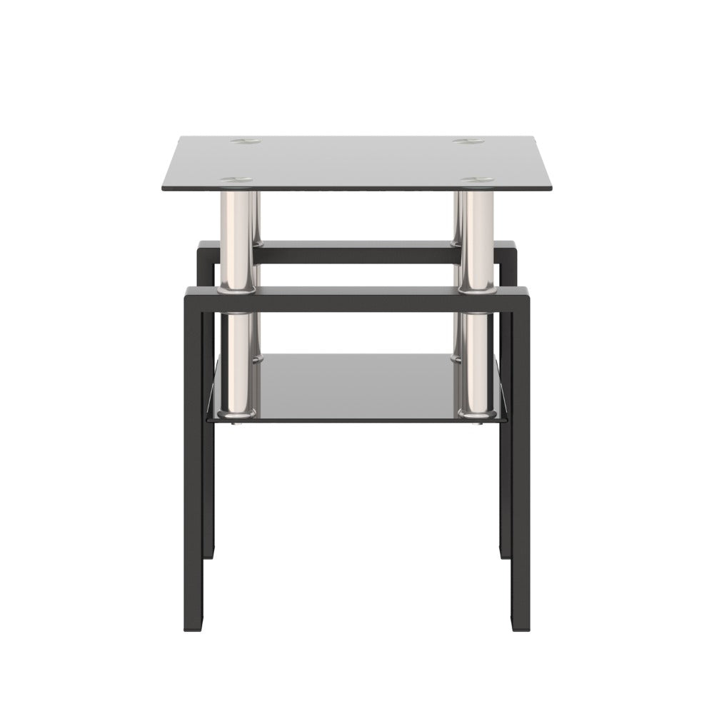 Kwadratowy stolik do salonu z blatem ze szkła hartowanego i stabilną metalową podstawą.