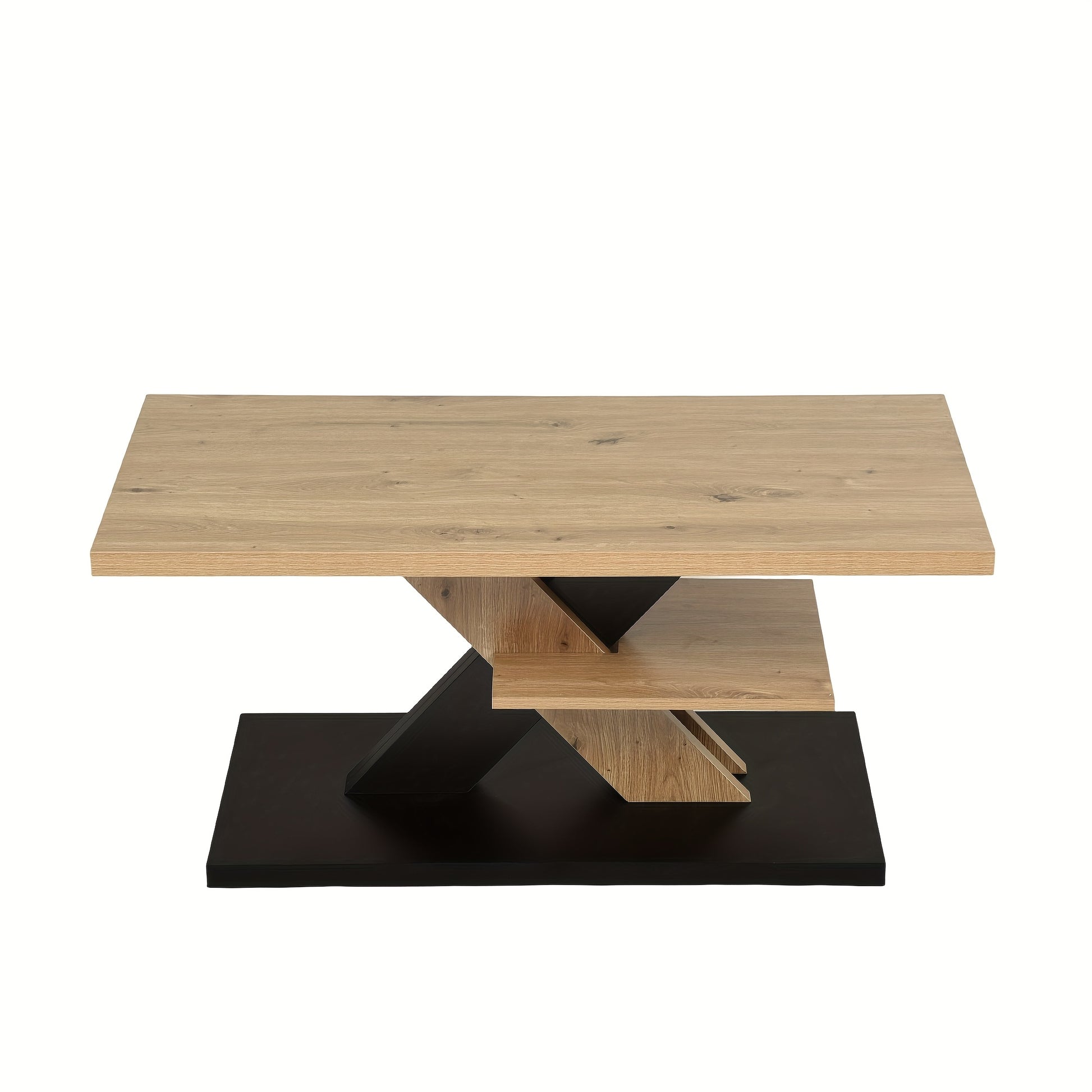 Stolik kawowy z geometryczną podstawą w kształcie litery X i prostokątnym blatem. Połączenie drewnianych elementów z metalem tworzy wyrazistą formę, która nadaje meblowi nowoczesny wygląd. Dolna półka zapewnia dodatkowe miejsce do odłożenia książek lub pilota, dzięki czemu stolik łączy estetykę z funkcjonalnością.