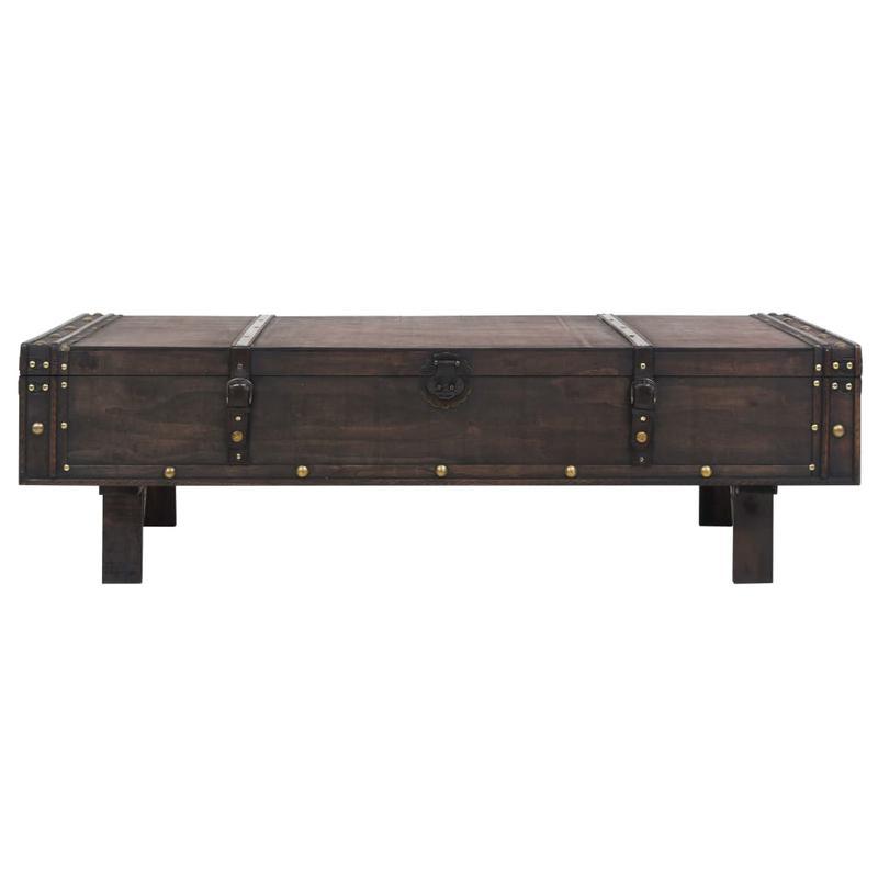 Stolik kawowy w formie kufra z dekoracyjnymi metalowymi okuciami i blatem otwieranym do góry. Jego zamknięta bryła nawiązuje do dawnych skrzyń podróżnych, a wewnętrzny schowek umożliwia przechowywanie drobnych przedmiotów. Sprawdzi się w salonie jako praktyczny element wystroju z wyrazistym charakterem.