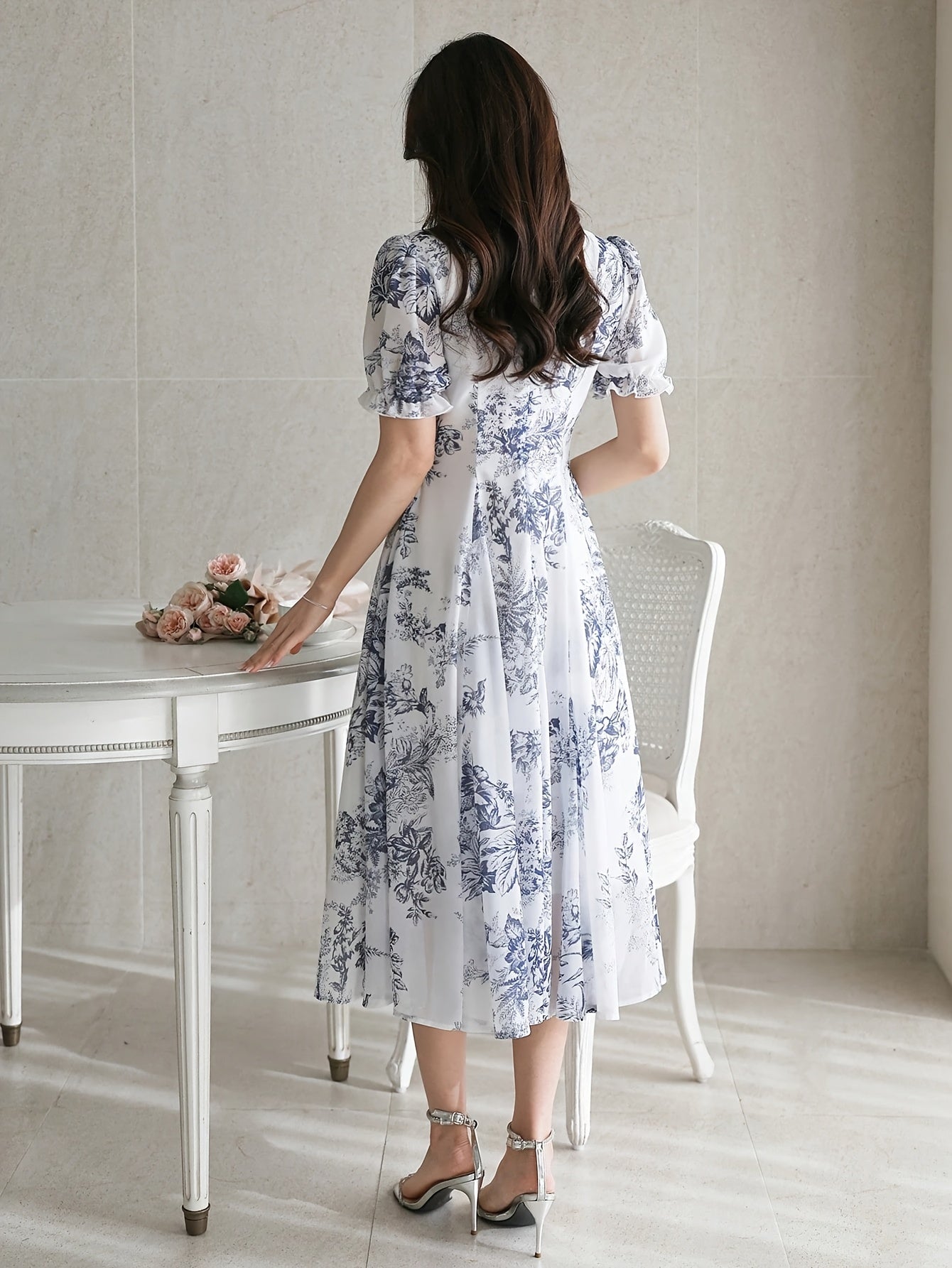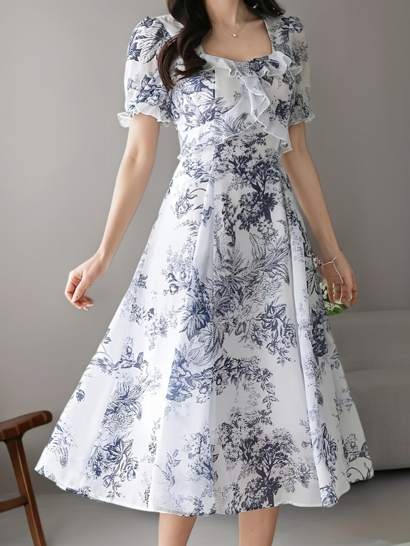 Sukienka damska midi z falą przy dekolcie i wzorem roślinnym
