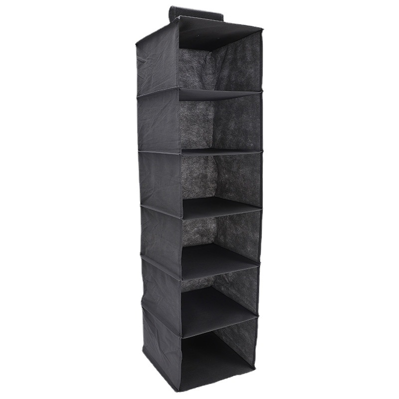Stojąca szafa pomaga rozdzielić ubrania i akcesoria na półkach oraz w kieszeniach. Konstrukcja łączy elementy z tekstylnymi wkładami.