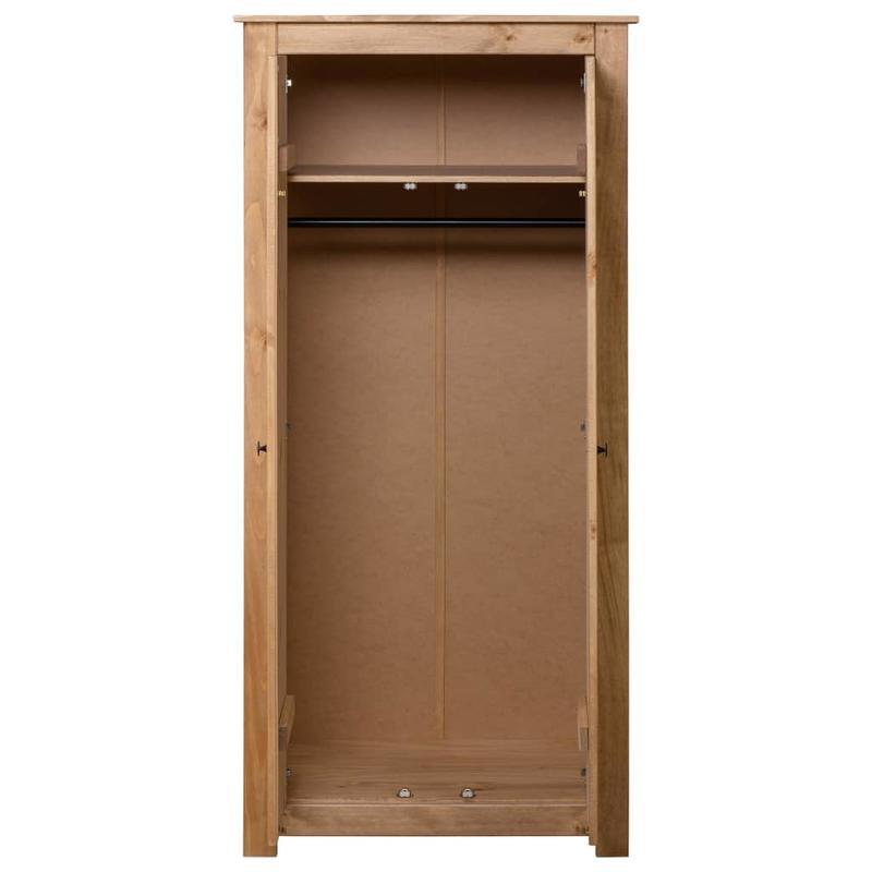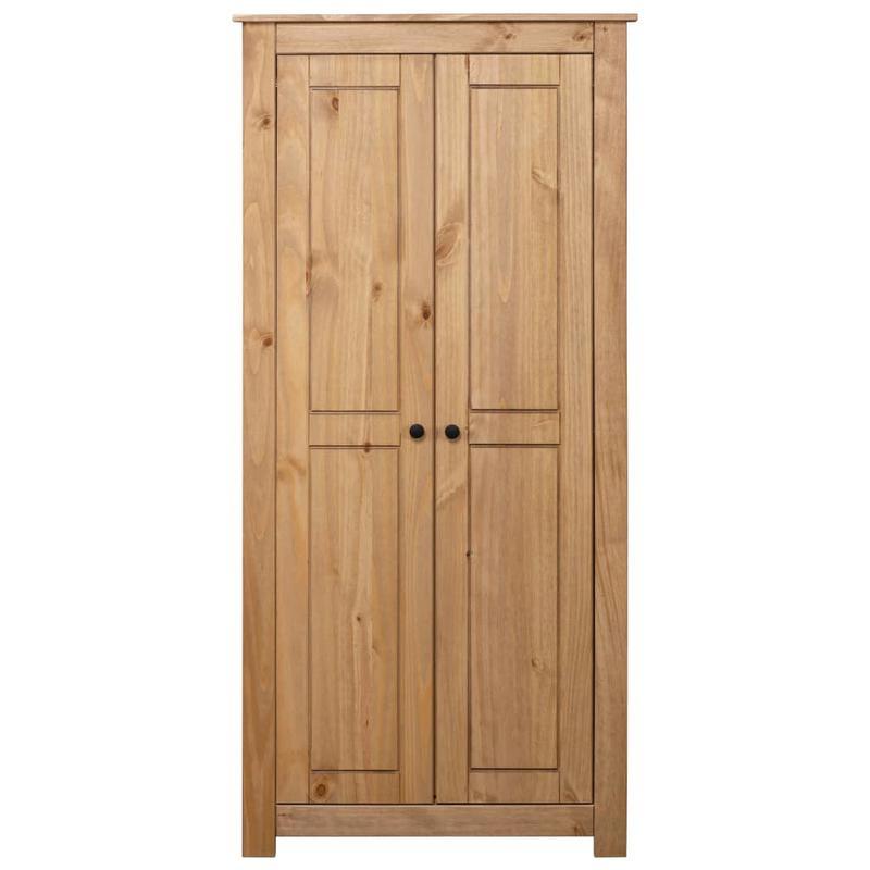 Szafa z dwuskrzydłowym frontem, w którym każde drzwi mają prostokątne panele osadzone w frezowanych ramach. Boki są pełne i jednolite, a górny blat tworzy lekko wystający panel. Dół szafy ma zamkniętą formę.