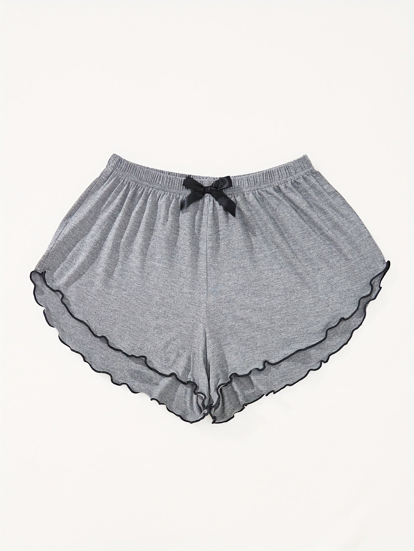 Szorty mają krótką linię z elastycznym pasem i kokardką na środku, a ich dół wykończony jest falistą krawędzią. Luźniejsze ułożenie w okolicy bioder podkreśla prostą formę i swobodny kształt.