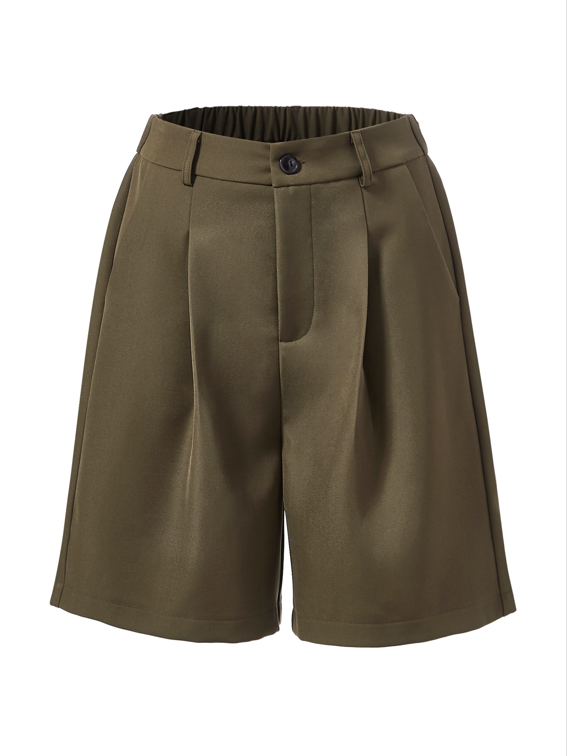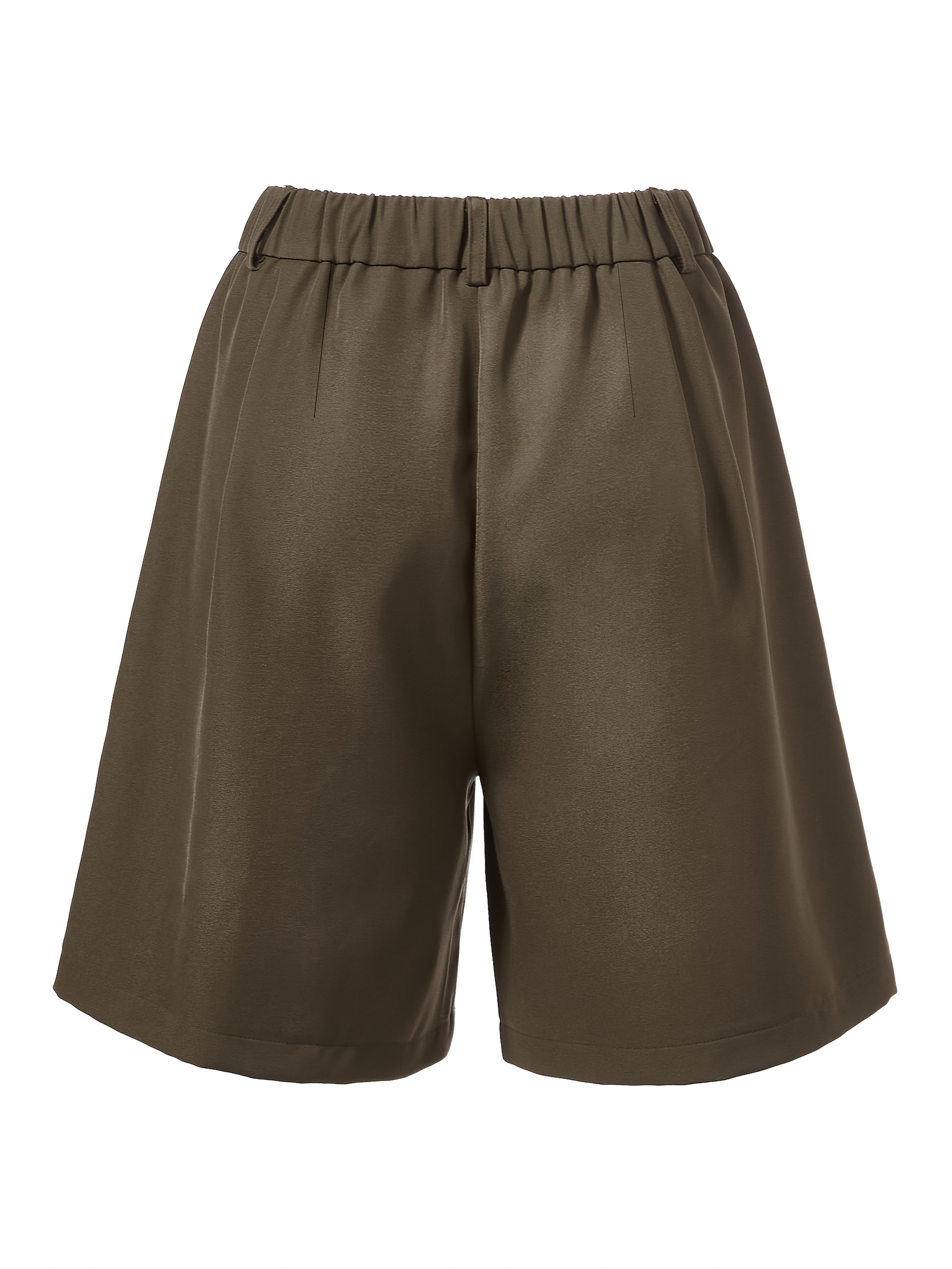 Szorty mają prostą linię z zapięciem na guzik i listwą na środku, a górna część łączy szlufki z elastycznym tyłem pasa. Przednie zakładki nadają im kształt o luźniejszym ułożeniu przy biodrach, a długość sięga nieco powyżej kolan.