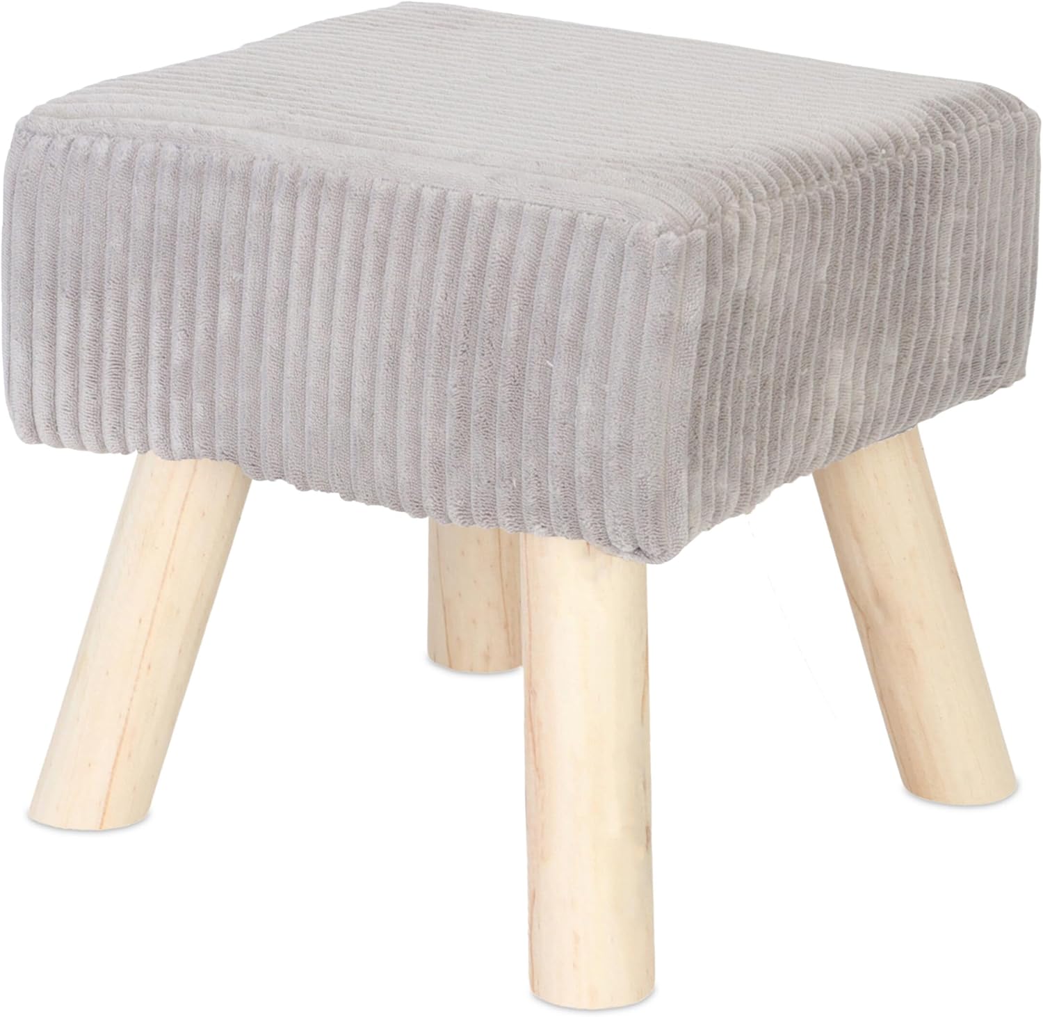 Taboret o zwartej, kwadratowej formie z siedziskiem pokrytym tkaniną o wyraźnej strukturze prążków. Cztery nogi z drewna rozmieszczone pod kątem tworzą stabilną podstawę i nadają całości prosty, codzienny charakter. Może służyć jako dodatkowe siedzisko, podnóżek lub niewielka podstawa pod roślinę bądź tacę.