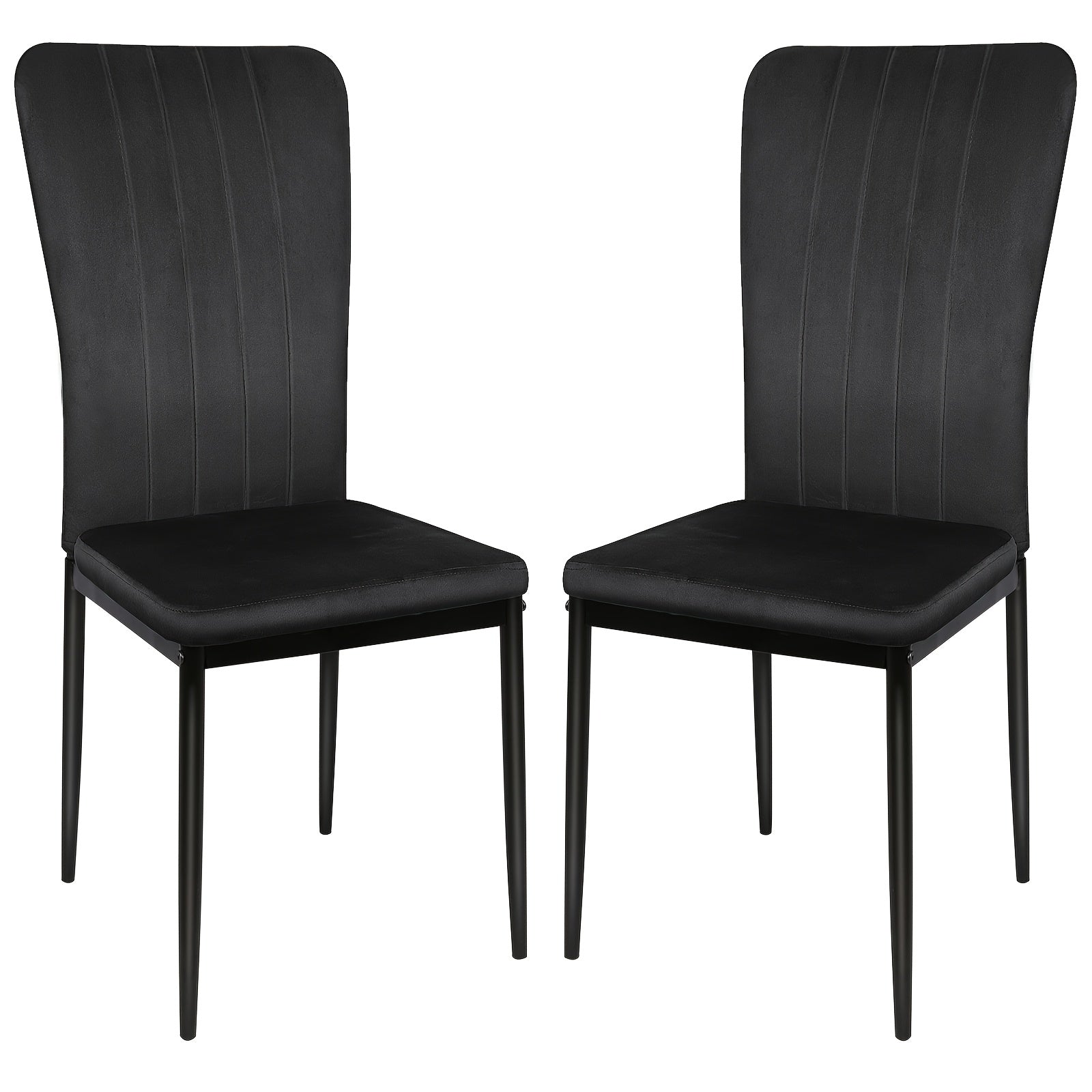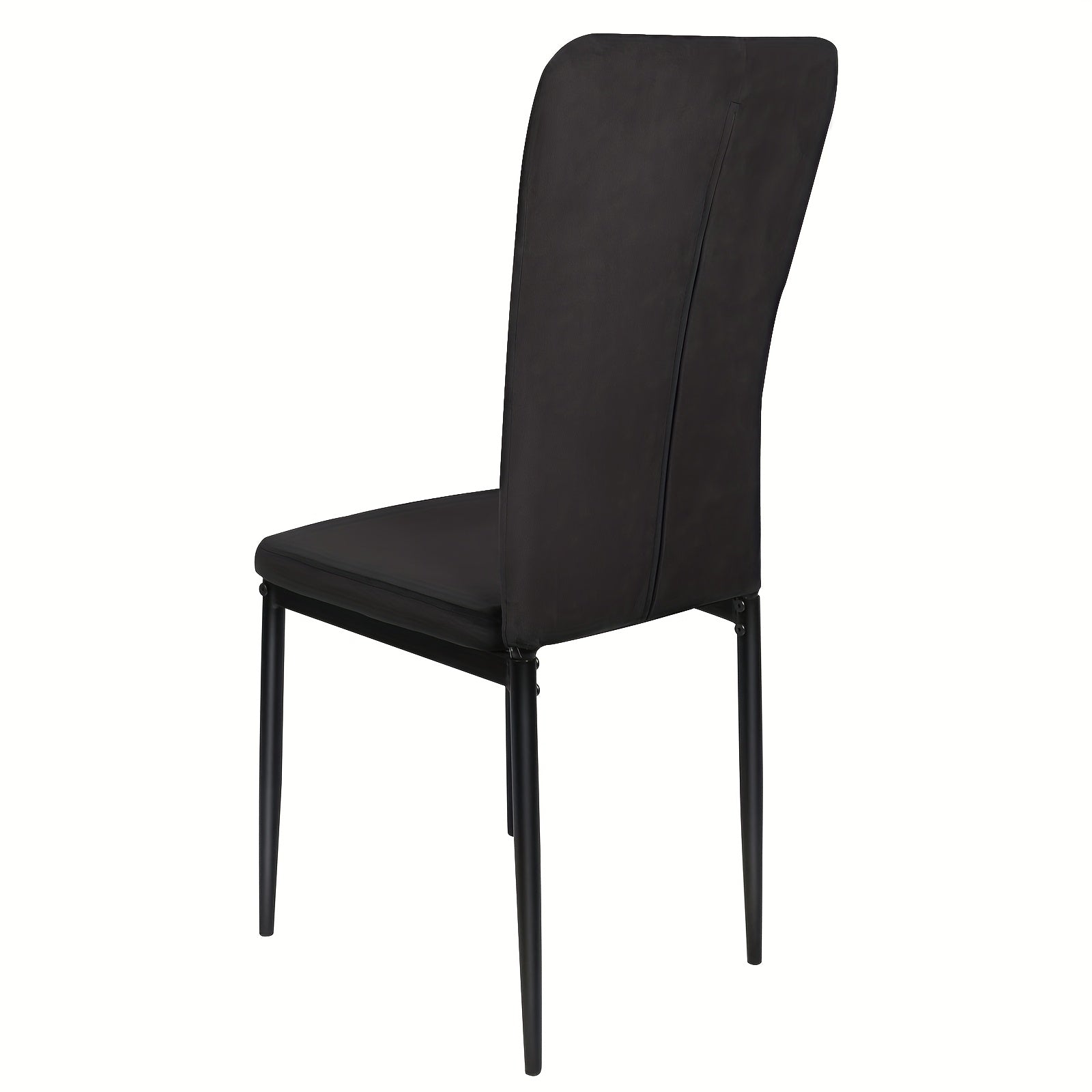 Krzesła mają wysokie oparcie o szerokim profilu, z pionowymi przeszyciami biegnącymi przez całą powierzchnię. Siedzisko jest równe i osadzone na metalowej ramie, w której nogi są ustawione prosto i mocowane tuż pod krawędzią siedziska. Taka konstrukcja trzyma stabilnie i dobrze nadaje się do codziennego siedzenia przy stole.